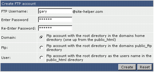 User: Deze gebruiker van FTP heeft alleen Toegang tot de public_html/username/ . Als wij deze optie in het bovengenoemd beeld selecteerde, dan heeft de FTP gebruiker alleen toegang tot public_html/gary/ of http://www.site-helper.com/gary/. (Als er nog een subdomein gary.site-helper.com heet, zal deze FTP gebruiker er ook toegang toe hebben.
