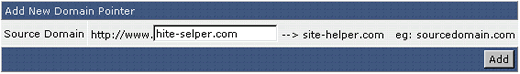 Laten we zeggen dat wij de domein naam hite-selper.com bezitten. In het bovenstaande voorbeeld creëren wij een pointer die er voor zorgt dat elke bezoeker van hite-selper.com wordt doorgestuurd naar site-helper.com. Klik op “Add” wanneer u klaar bent met het invoeren.
