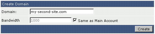 Ten tweede selecteert u de bandbreedte die beschikbaar is voor dit domein. Als u slechts 1 gig traffic per maand wilt, voert u 1000 in in het "Bandwidth" tekstvakje. Als u bandbreedte met uw hoofddomein wilt delen, zonder beperking, vink dan de "Same as Main Account" box aan. Tot slot klikt u op "Create".