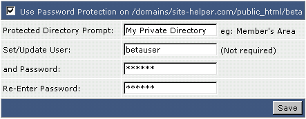 Daarna vinkt u het vakje aan de bovenkant van de lijst aan. Vul de Directory Prompt in (een beschrijving van het wachtwoord beveiligde directory) en de gebruikersnaam van de directory. Klik op "Save."