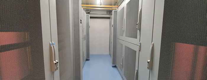 Het datacenter beschikt over 2 dataruimtes met een totaaloppervlak van 75m2, welke goed is voor 30 racks. Het datacenter beschikt in tegenstelling tot onze andere datacenters niet over een verhoogde vloer. De koeling is heel slim verwerkt middels in-row koelers. Daarmee zijn de racks volgens het cold coridor principe opgesteld (warme en koude straten). De bekabeling is netjes boven de kasten aangelegd in kabelgoten.